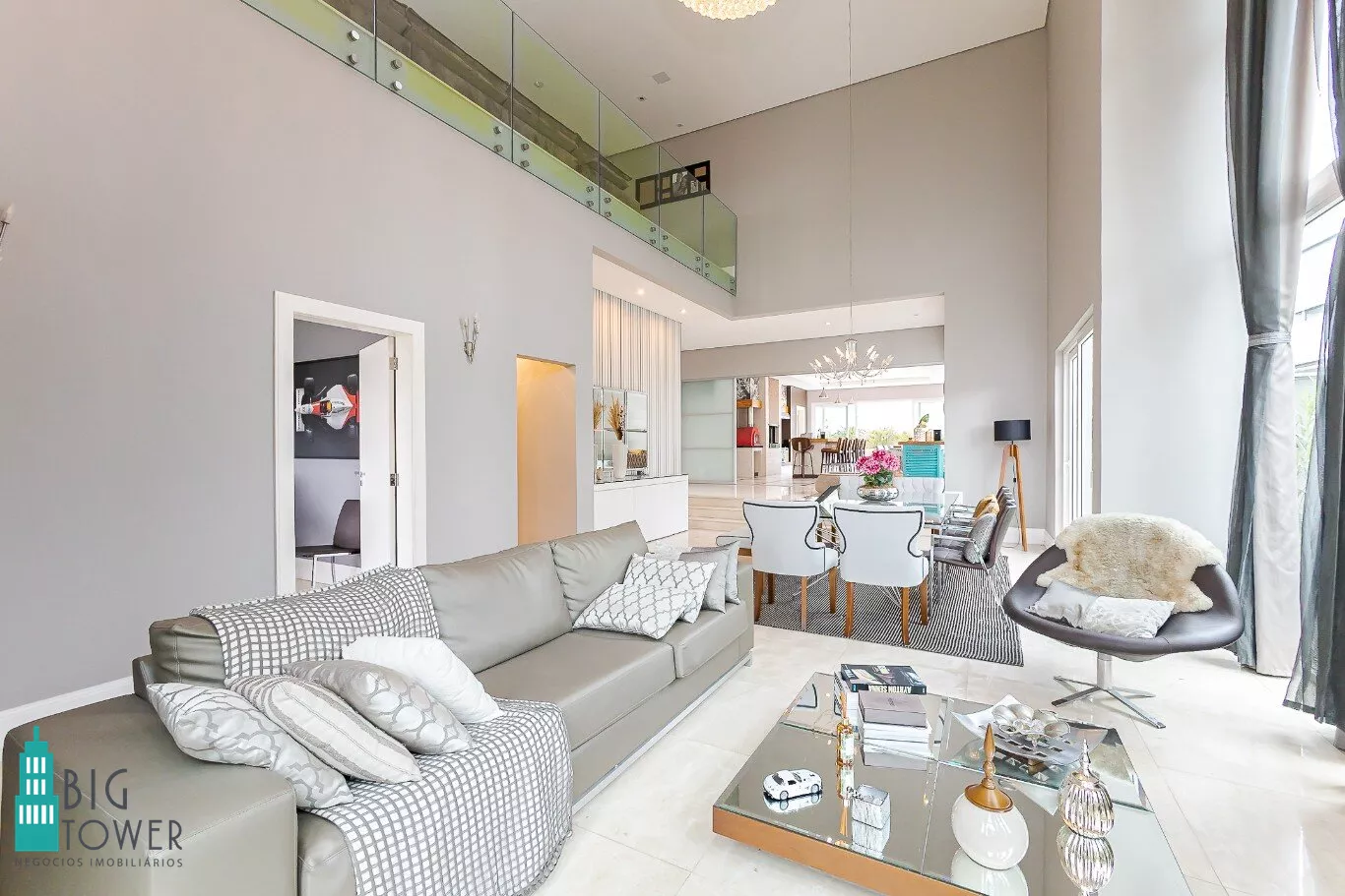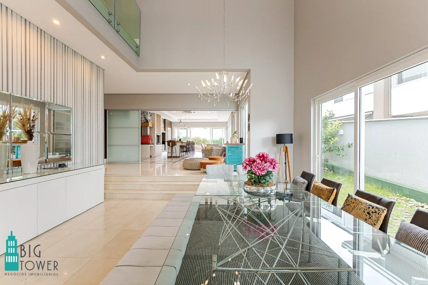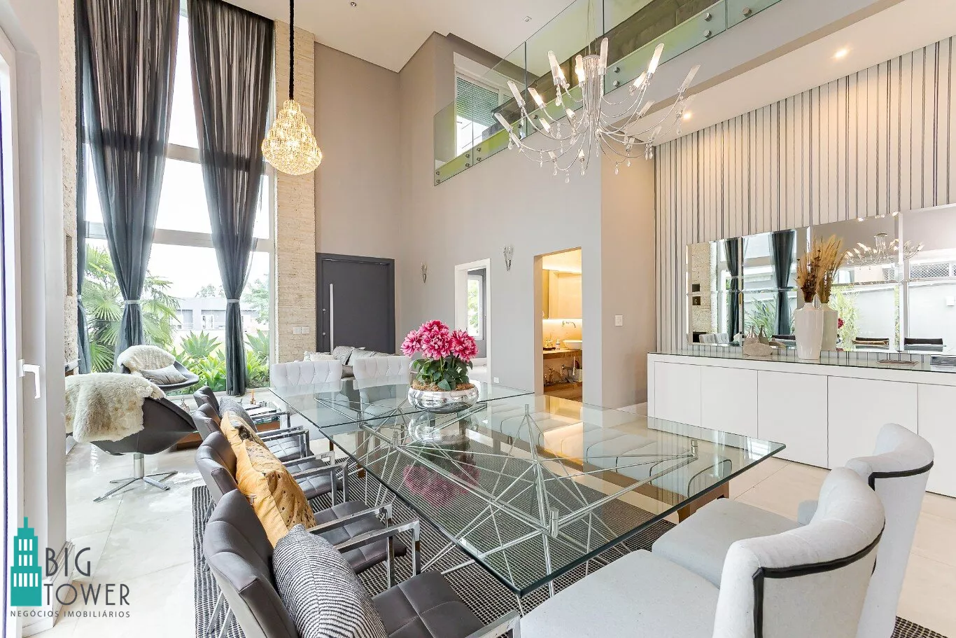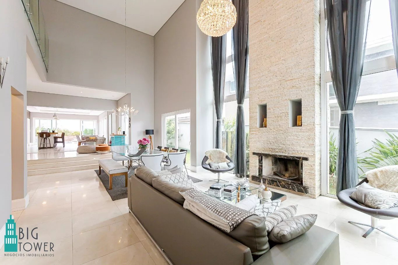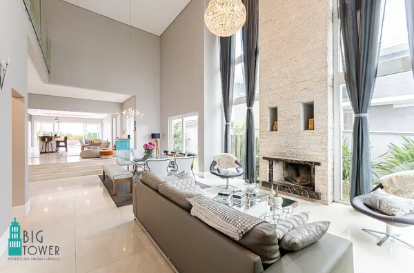 - Sala de estar e jantar com pé direito alto de 7 metros e lareira