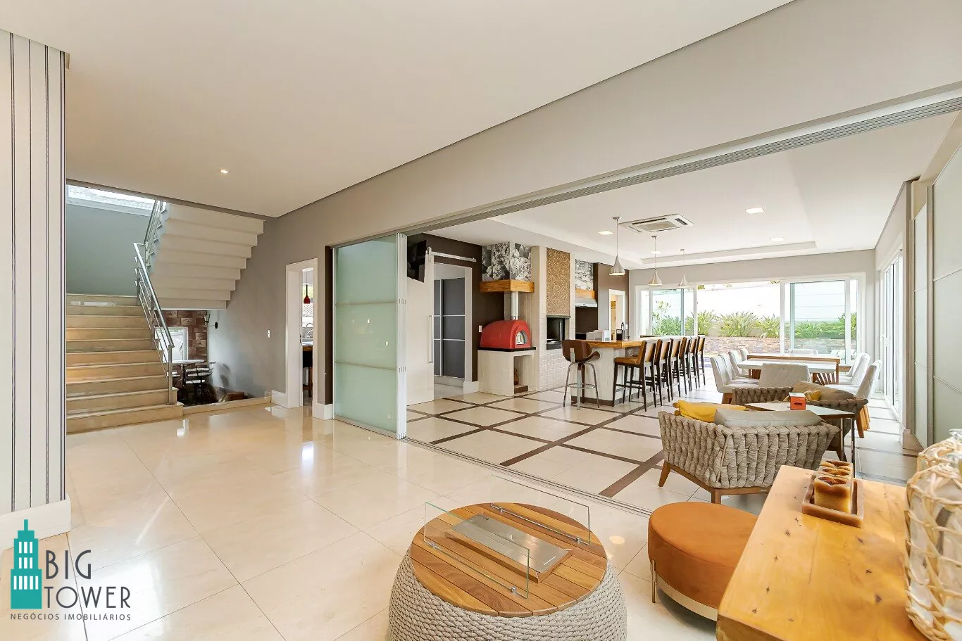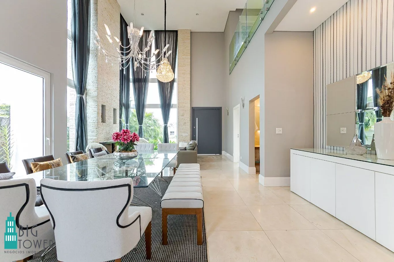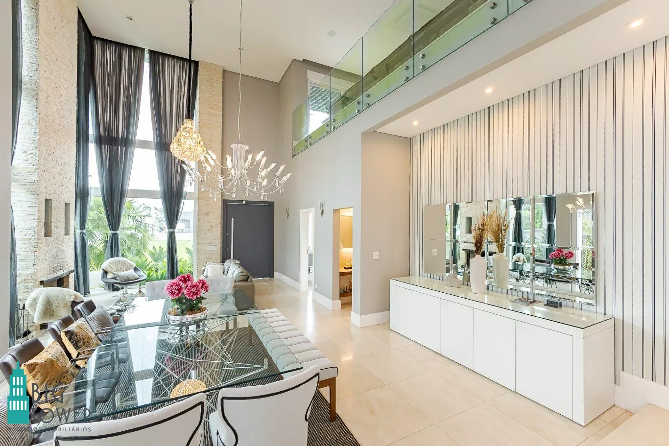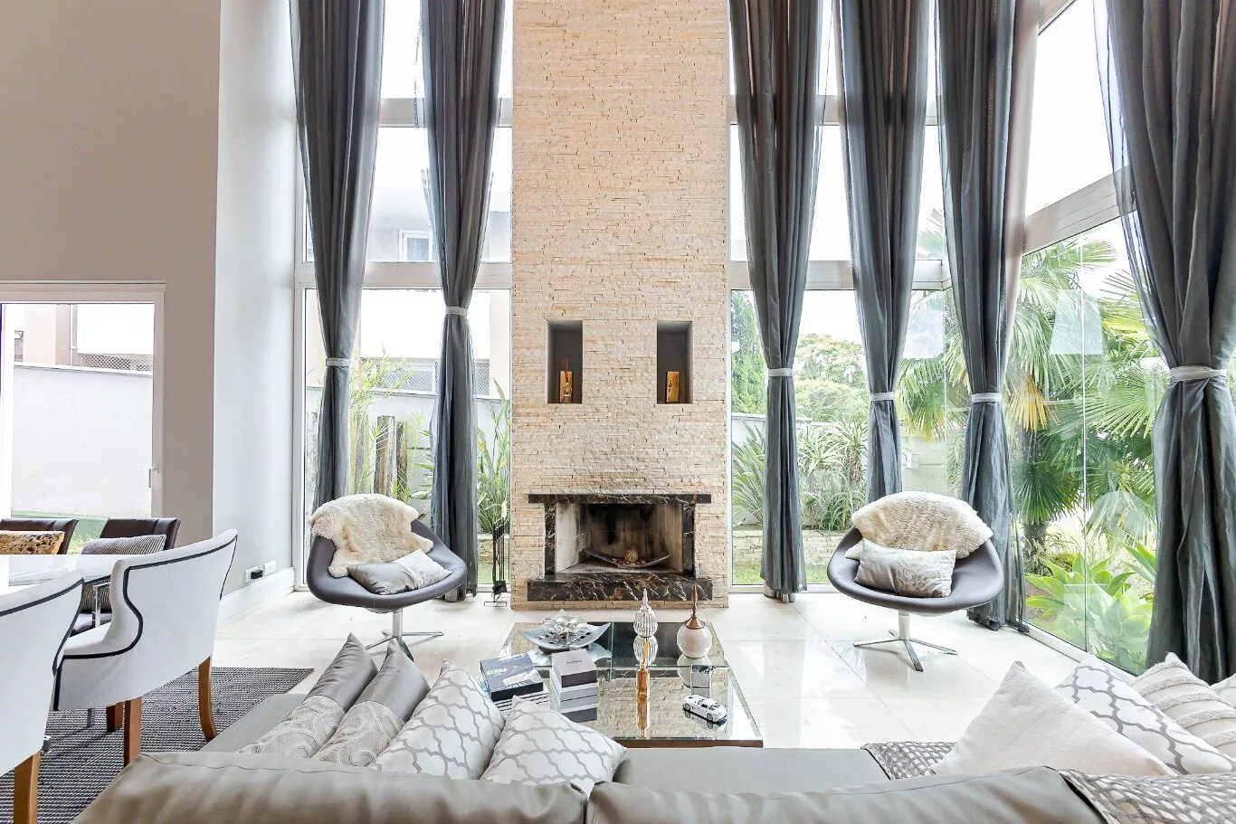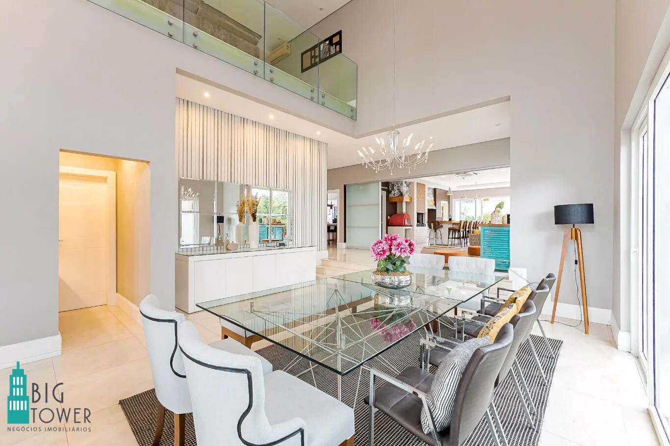 - Sala de estar e jantar com pé direito alto de 7 metros e lareira