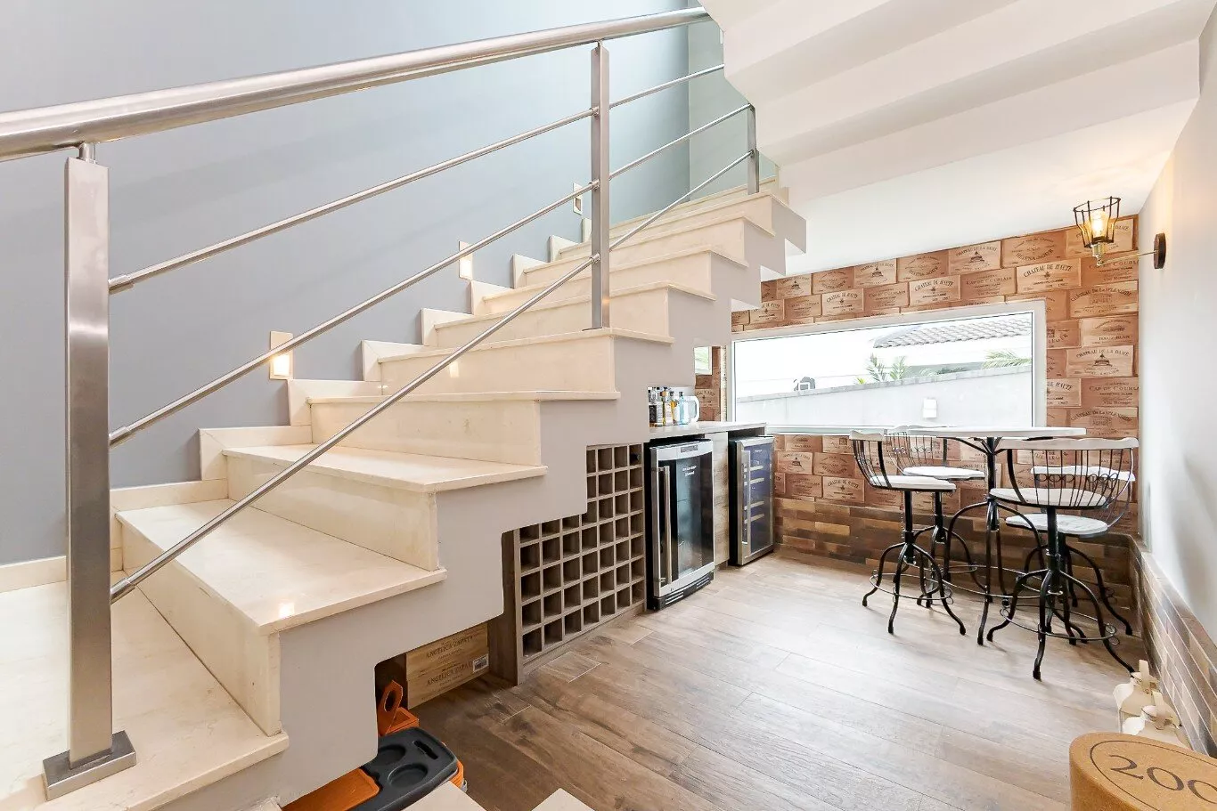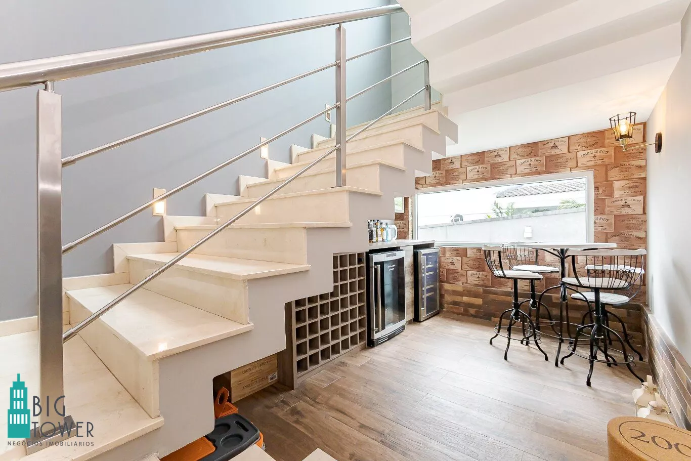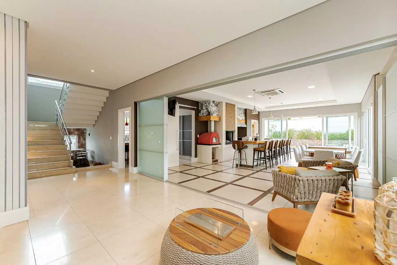 - Acabamento em mármore Crema Marfil espanhol em toda sala e escada